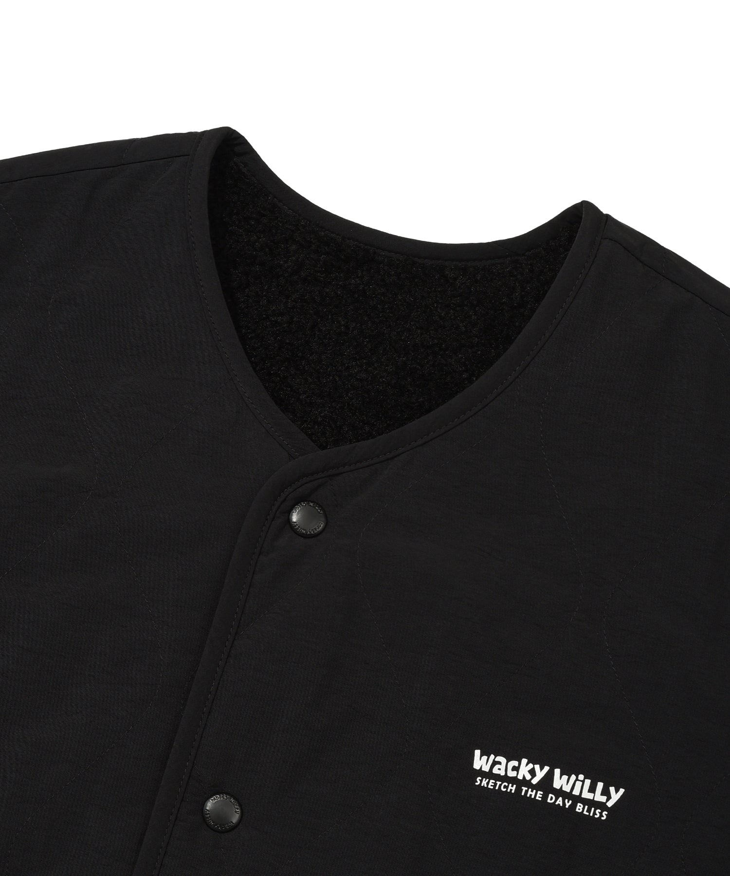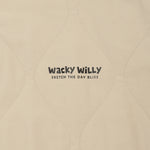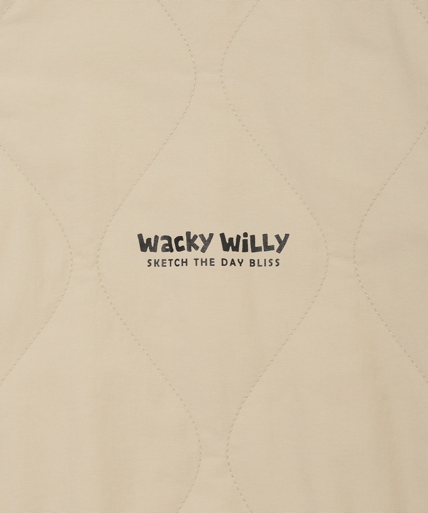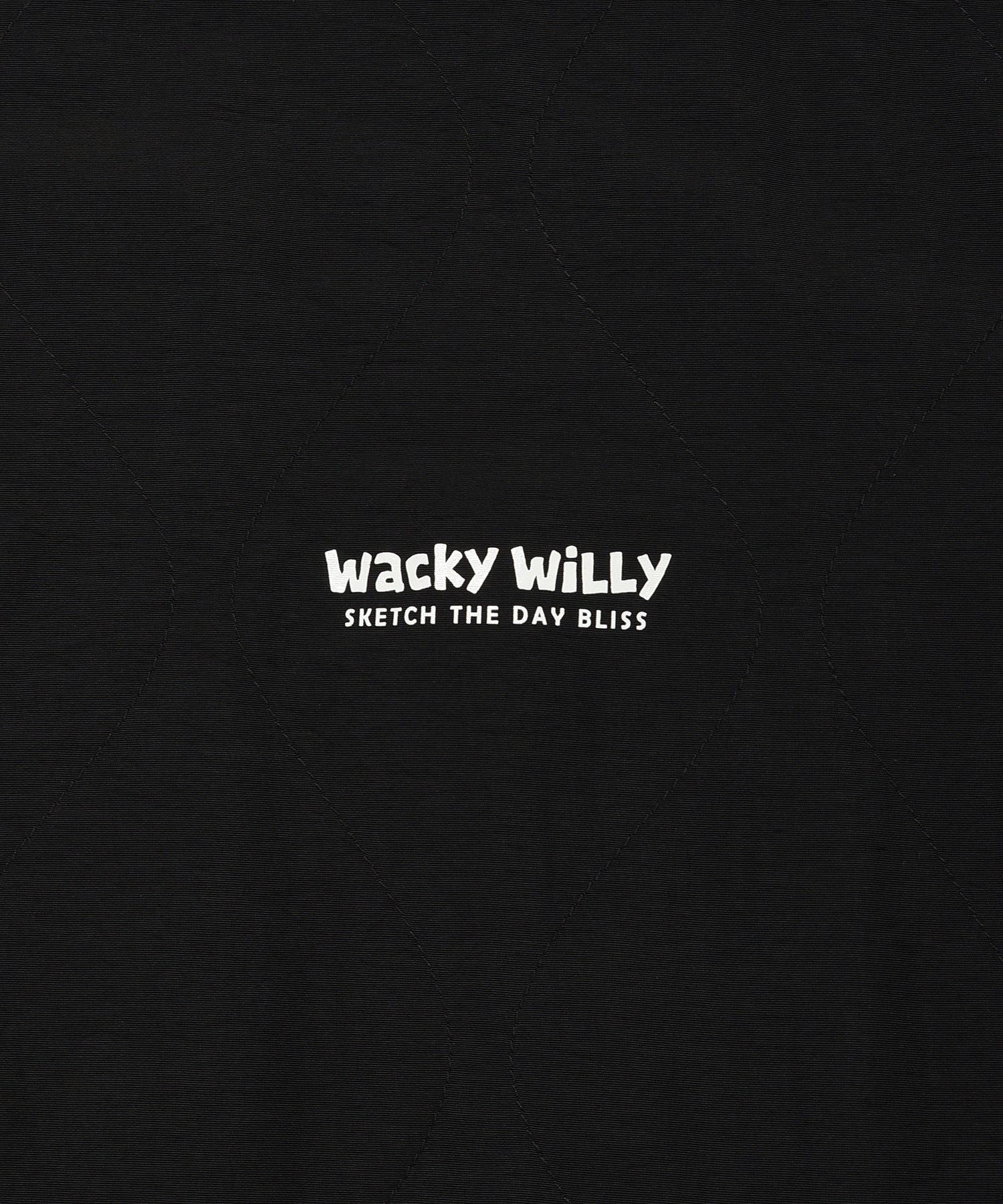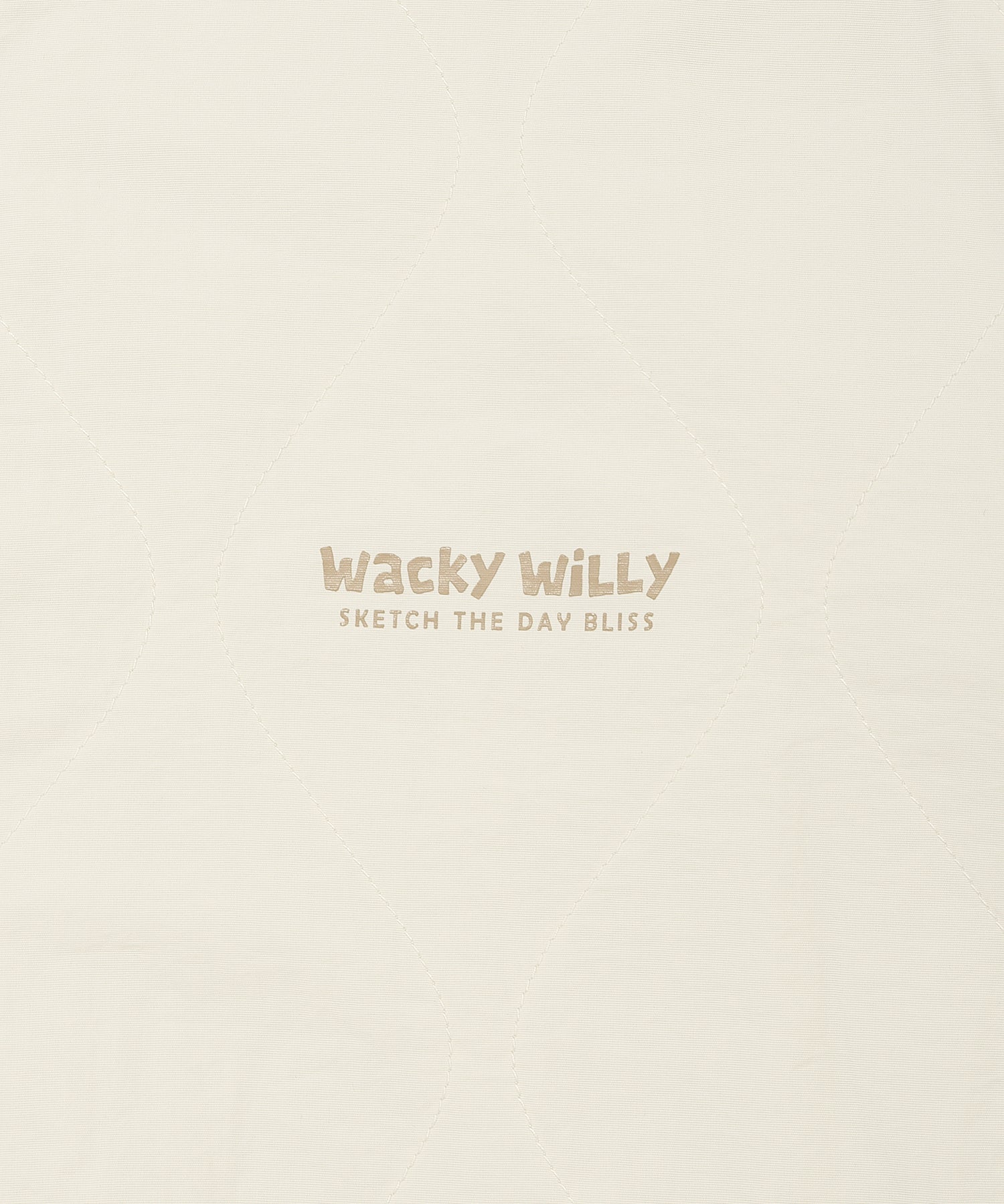 織りコットン部分にはワッキーウィリーのタイポグラフィックデザインを施し、フリースコットンのジャーキルティングで保温性も確保した仕様です。