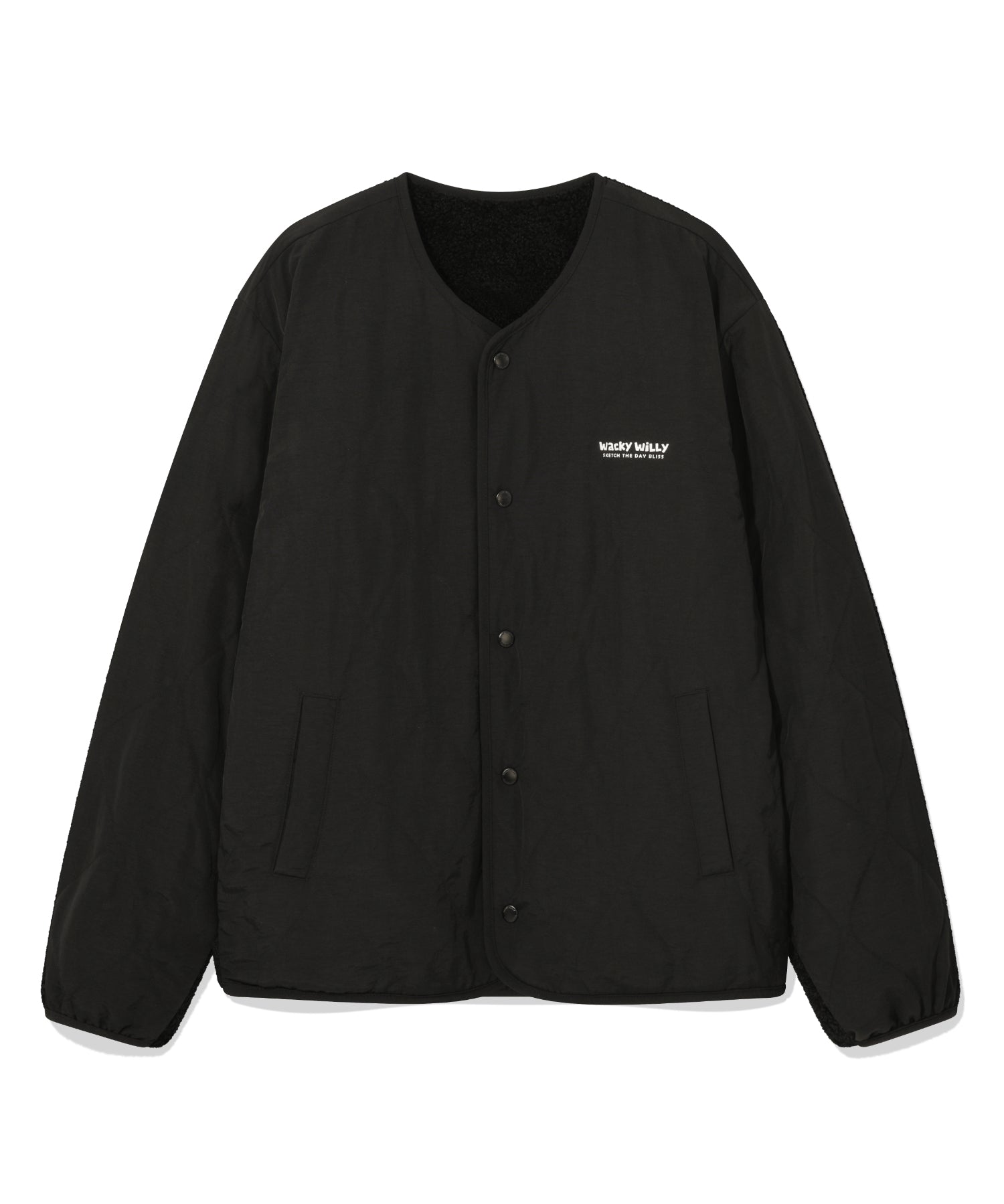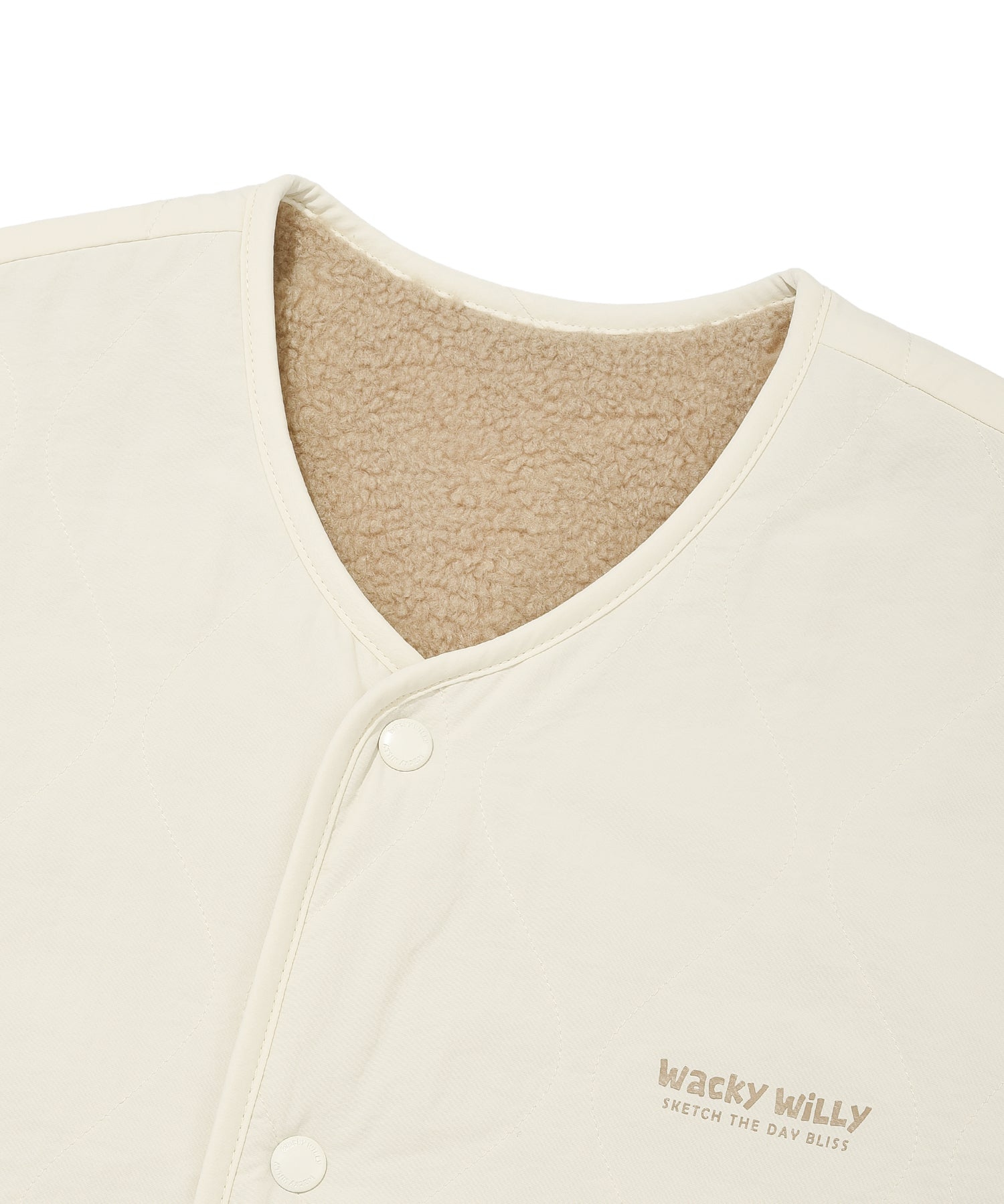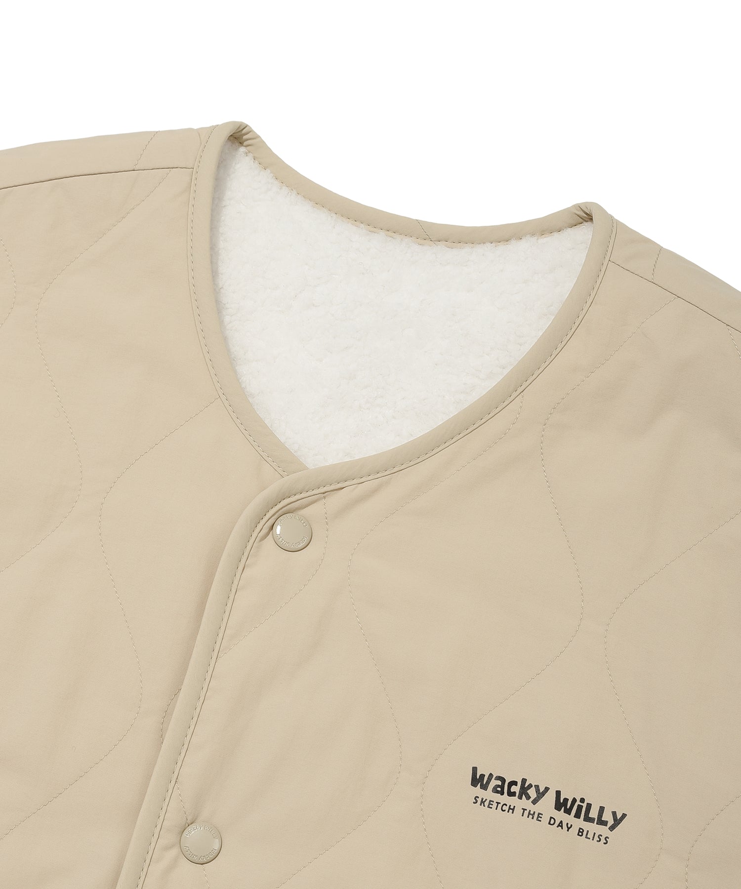 織りコットン部分にはワッキーウィリーのタイポグラフィックデザインを施し、フリースコットンのジャーキルティングで保温性も確保した仕様です。