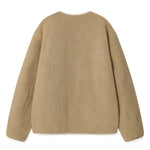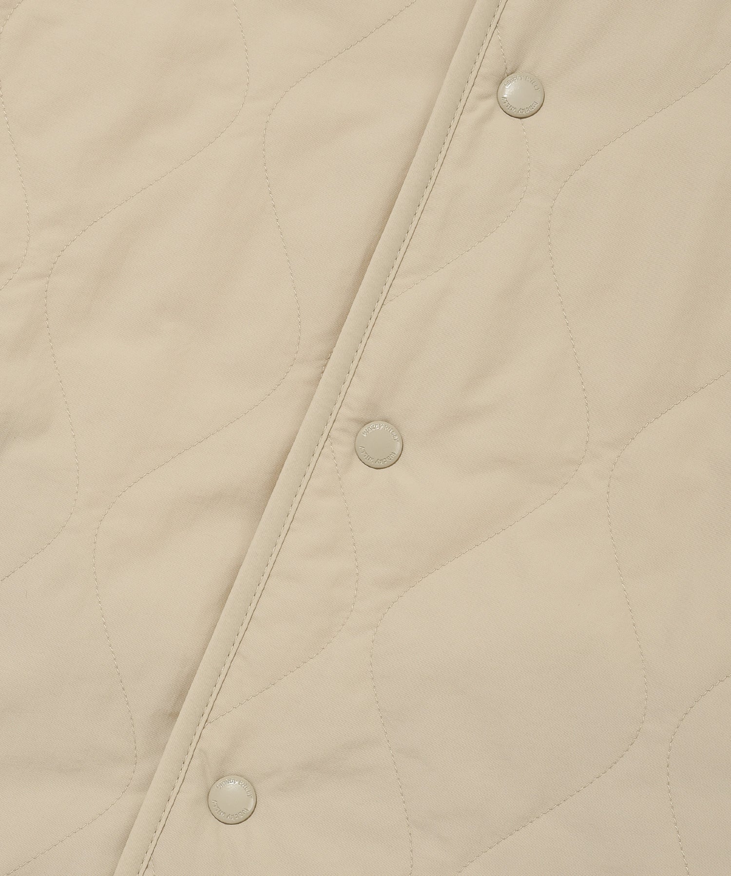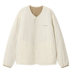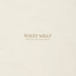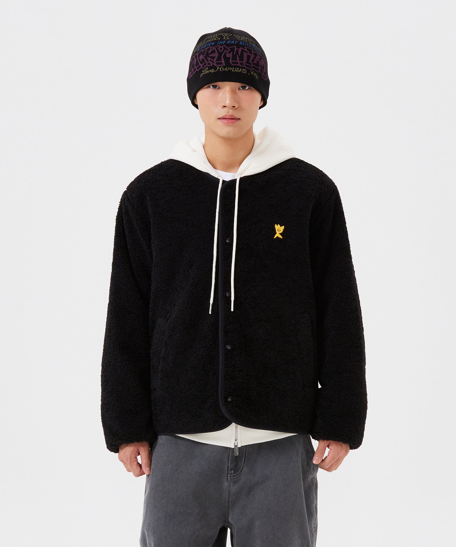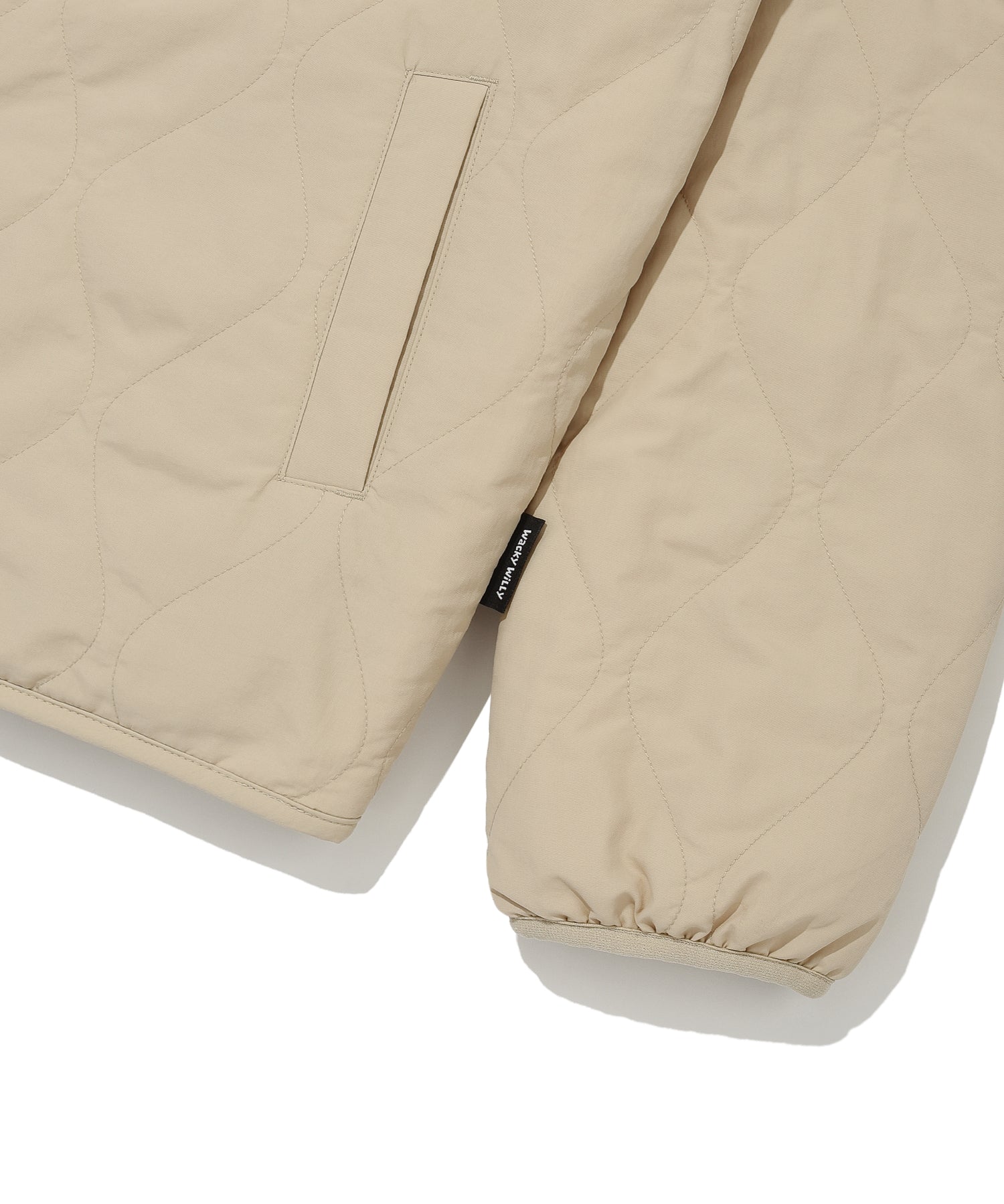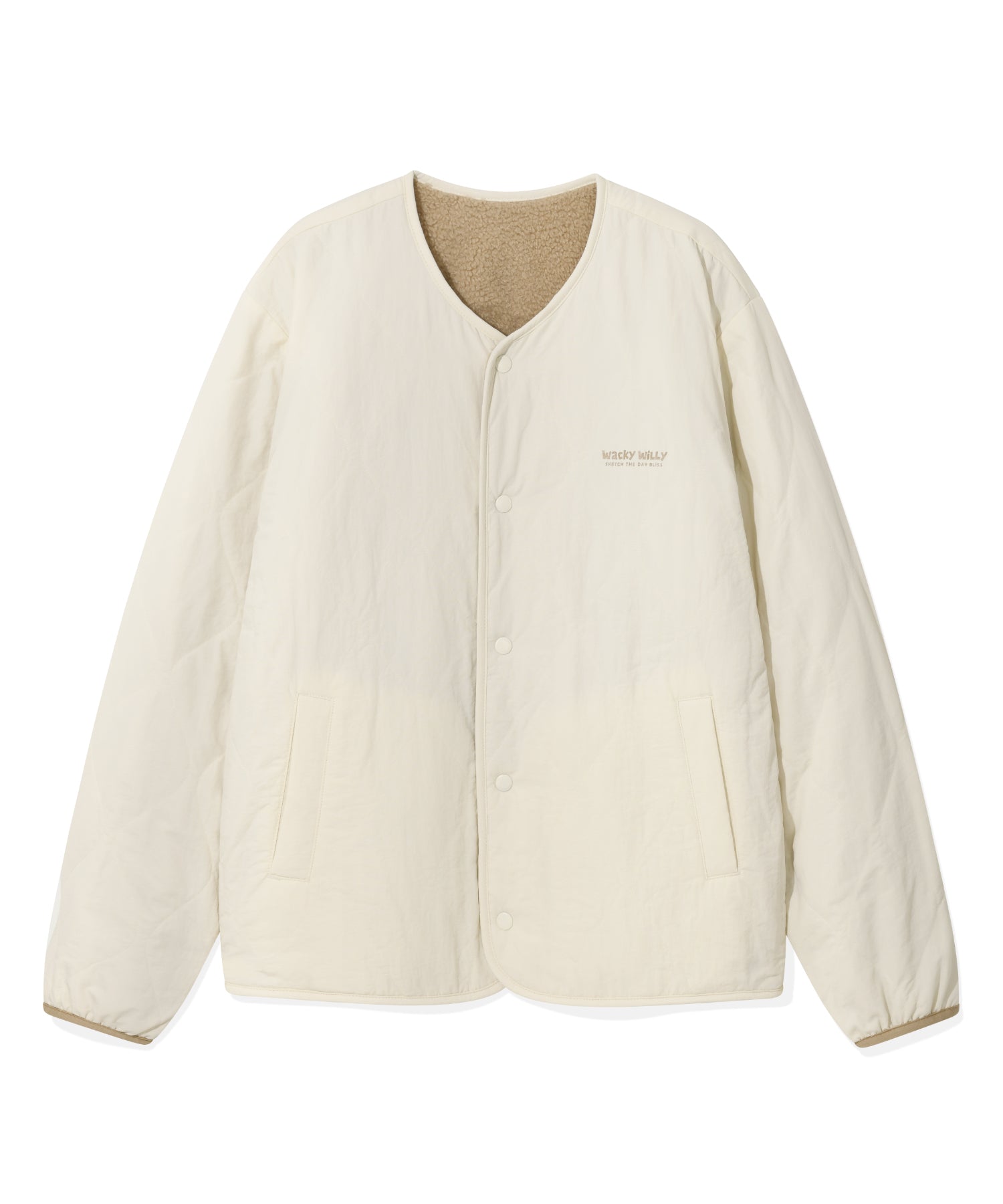 織りコットン部分にはワッキーウィリーのタイポグラフィックデザインを施し、フリースコットンのジャーキルティングで保温性も確保した仕様です。