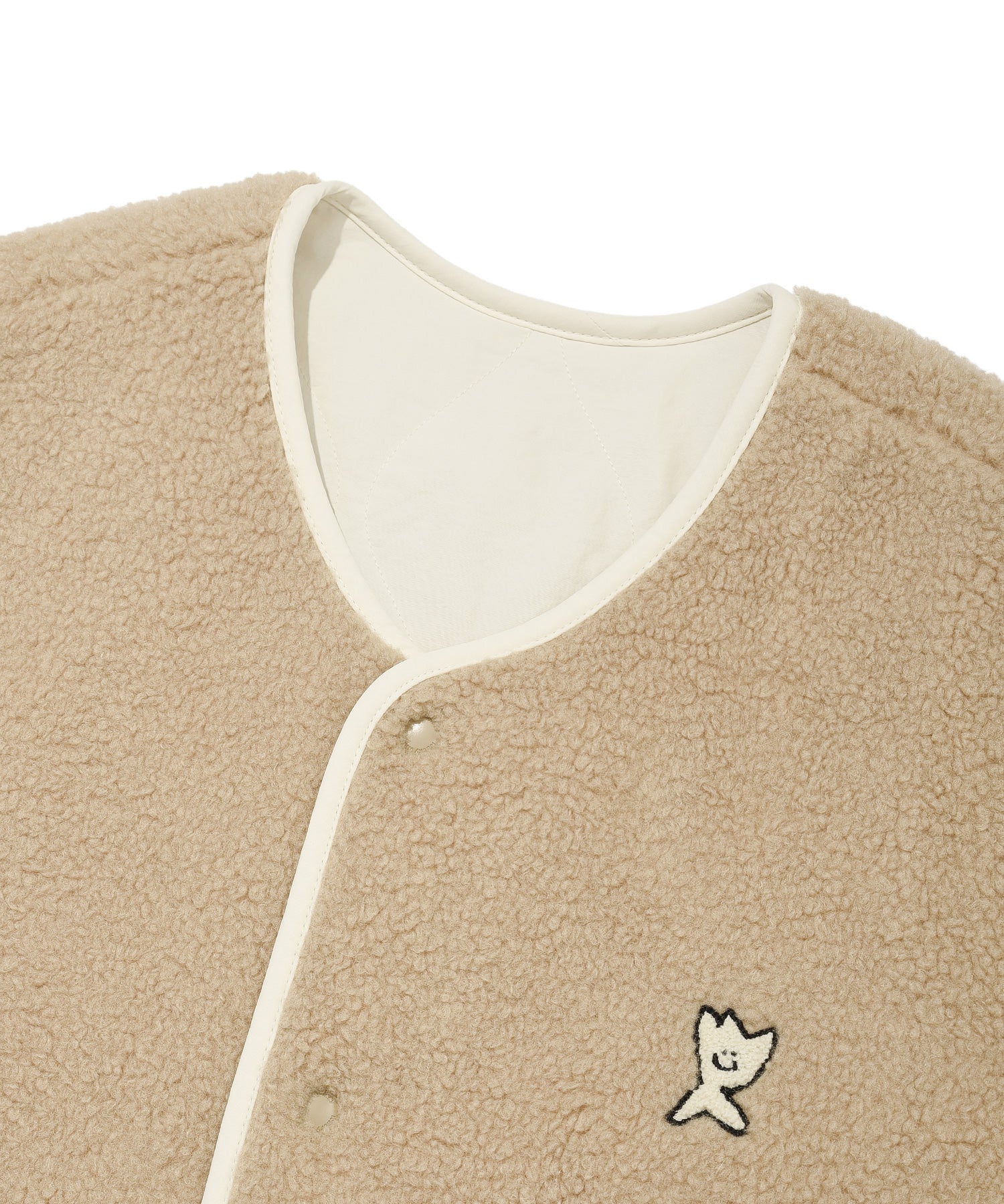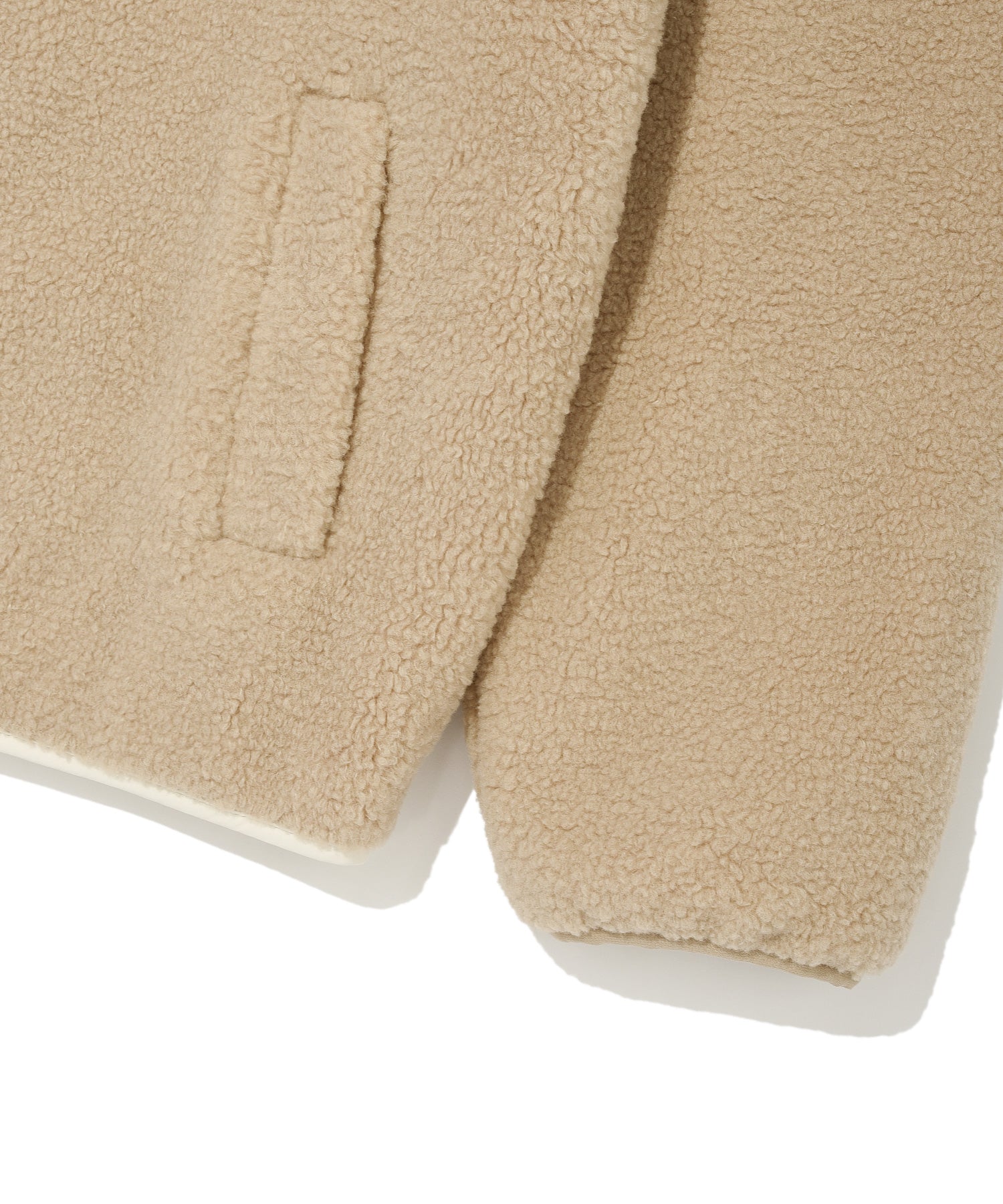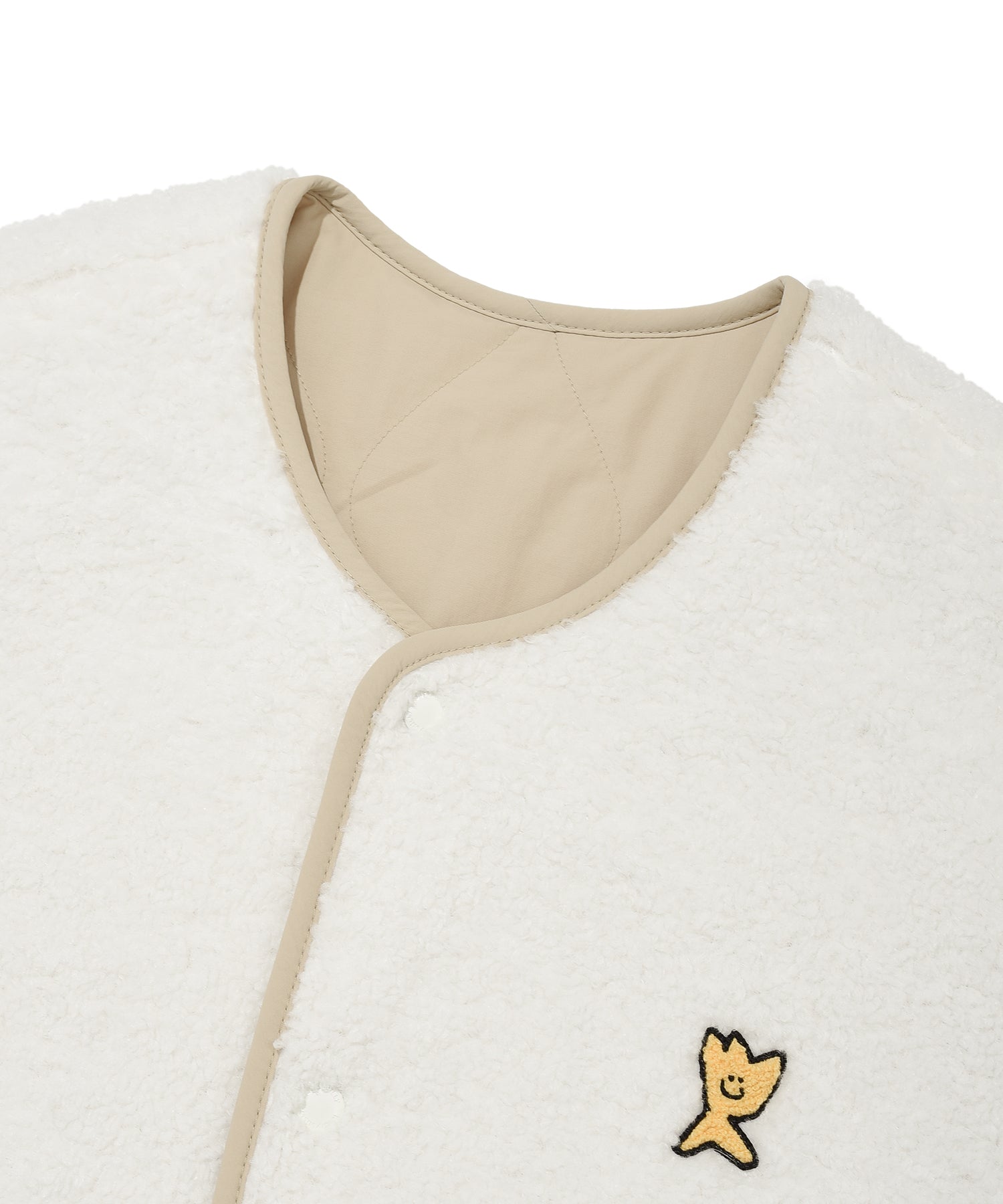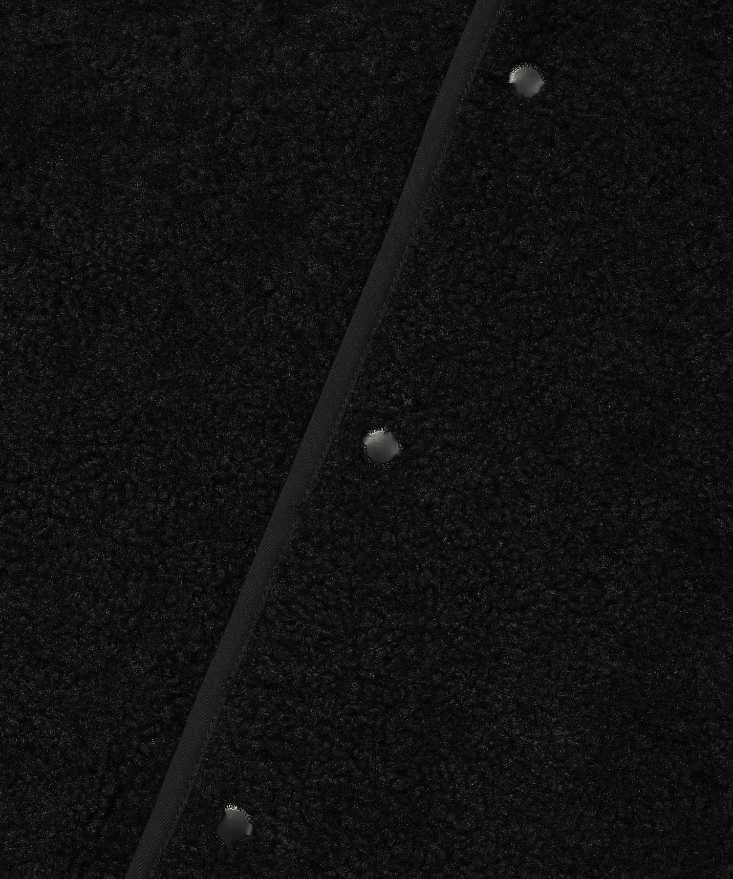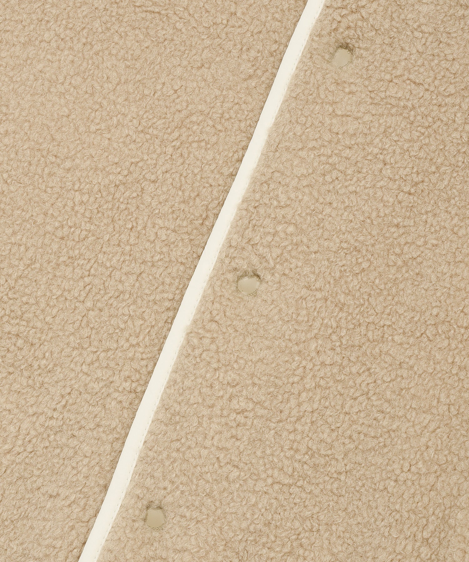 トーンオントーンのベーシックカラーでまとめ、フリース部分には表面に凹凸感のあるコットン素材の刺繍ワッペンをあしらいました。