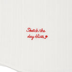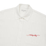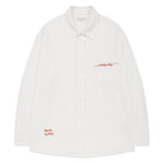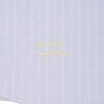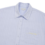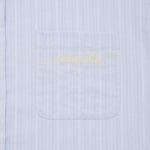 胸ポケットにあしらわれたブランドロゴの織りネームや、裾部分のレタリング織りネームが、シンプルなデザインにさりげないアクセントを添えています。